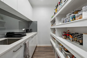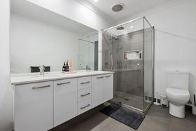 The master bedroom is massive and offers not only one but two massive walk-in robes as well as a stunning ensuite boasting double vanities nestled on a stone bench and a bigger shower with double shower head. The walk-in linen press in the hall offers space for your bags or shoes as it's adjacent to the internal access for the garage and the spacious laundry with more even more cabinets for storage.
