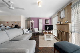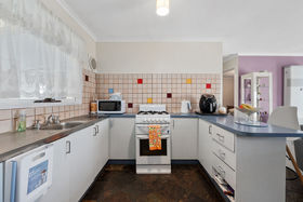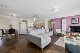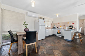 Inside, the master bedroom provides a spacious retreat, while the second and third bedrooms are well serviced by a central bathroom. The large open living and meals area is overlooked by the kitchen, creating a practical and low-maintenance space, enhanced by durable slate flooring.