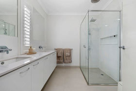 The expansive master suite is a private retreat, complete with a large walk-in wardrobe, and a luxurious ensuite. Enjoy the double vanity with extra bench space, an oversized shower with tiled base, undermount sinks, and classic plantation shutters.
