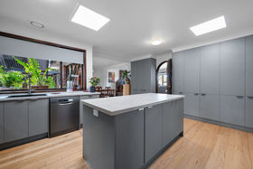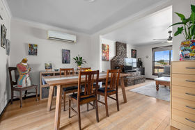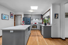 At the heart of the home lies a newly renovated kitchen, showcasing a large island bench, sleek cabinetry, and quality appliances including an oven, induction cooktop, and dishwasher. This impressive kitchen seamlessly adjoins the light-filled dining and living zones, creating a warm and functional hub perfect for family living and entertaining.